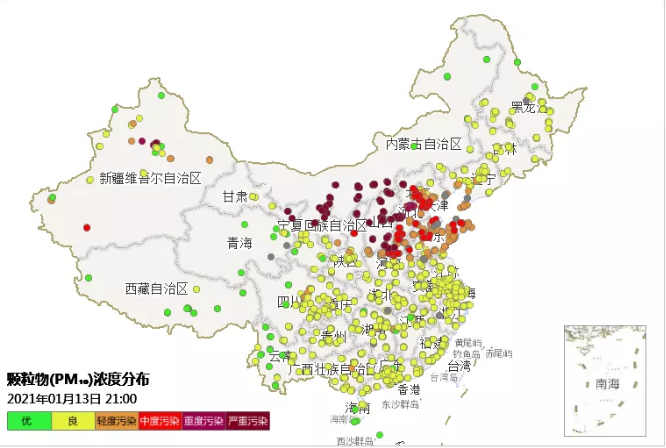 1月13日21時(shí)全國PM10小時(shí)濃度分布